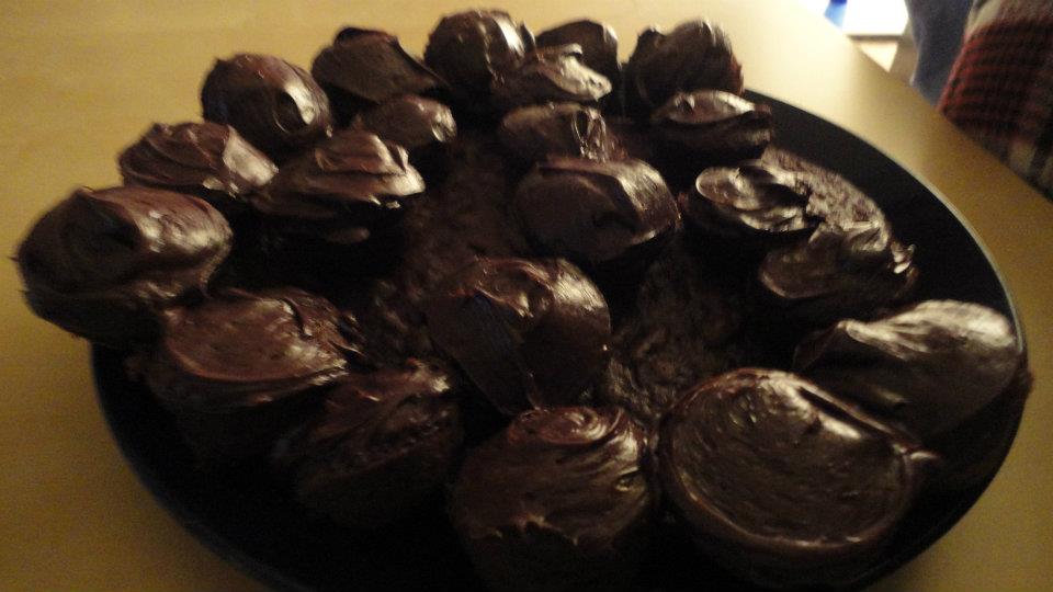I made mini-cupcakes with devil's food cake mix plus your regular old chocolate icing. You'll also see I made a flat piece of cake to put underneath the cupcakes too!